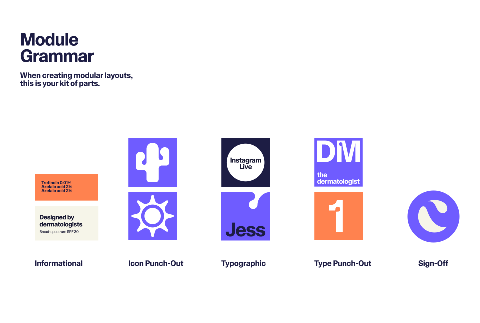 It made perfect sense to represent personalization with a modular system. Skincare has to be adaptable and something that is easily fit into one’s routine. Using a modular system allows the design to flex to equally represent a regimented order but also a human touch as the modules playfully scale into place.